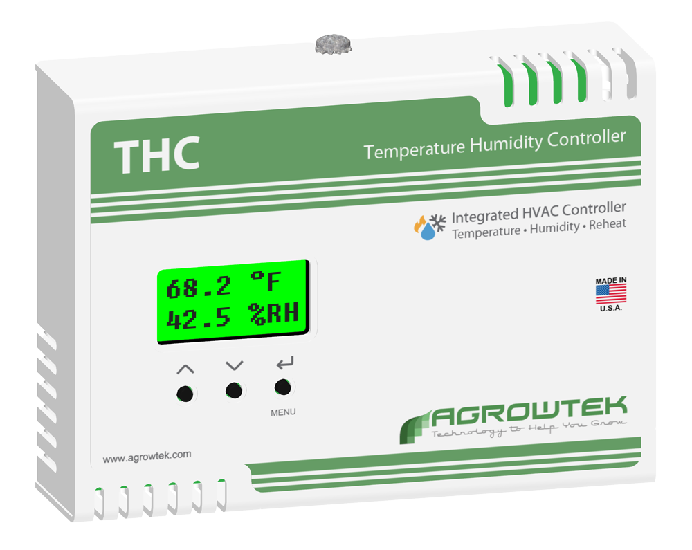 DescriptionTHC series Temperature and Humidity Controllers are designed for intelligent control of standard HVAC systems and dehumidifiers in growing environments. Featuring advanced reheat and external humdity control options that are unique to indoor agriculture requirements. Operate heating, cooling, reversing valves, reheat dehumidification and standard humidity equipment using 24VAC control. Connects to GrowControl™ GCX Cultivation Control Systems for operation from a central controller. Monitor, log and grapth the THC's temperature and humidity data, operate from a external canopy sensors instead of the internal sensor, andschedule automatic changes to the set points. The THC controller can operate off of the HVAC system's 24VAC power source as a stand-alone controller, or as a backup to continue operating in the event that the main control system becomes disconnected. Six (6) total output contacts are integrated; (1) fan contact, (2) cooling stage contacts, (2) heating stage contacts and (1) separate configurable humidity contact for external humidifiers or dehumidifiers. GrowControl™ GCX Integration