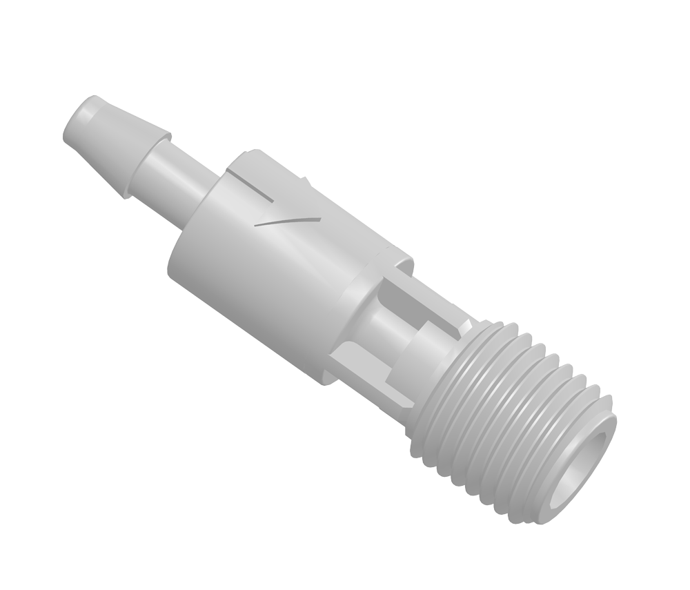 Barb tube fitting with check valve for BDX fertigation machine injection manifolds.