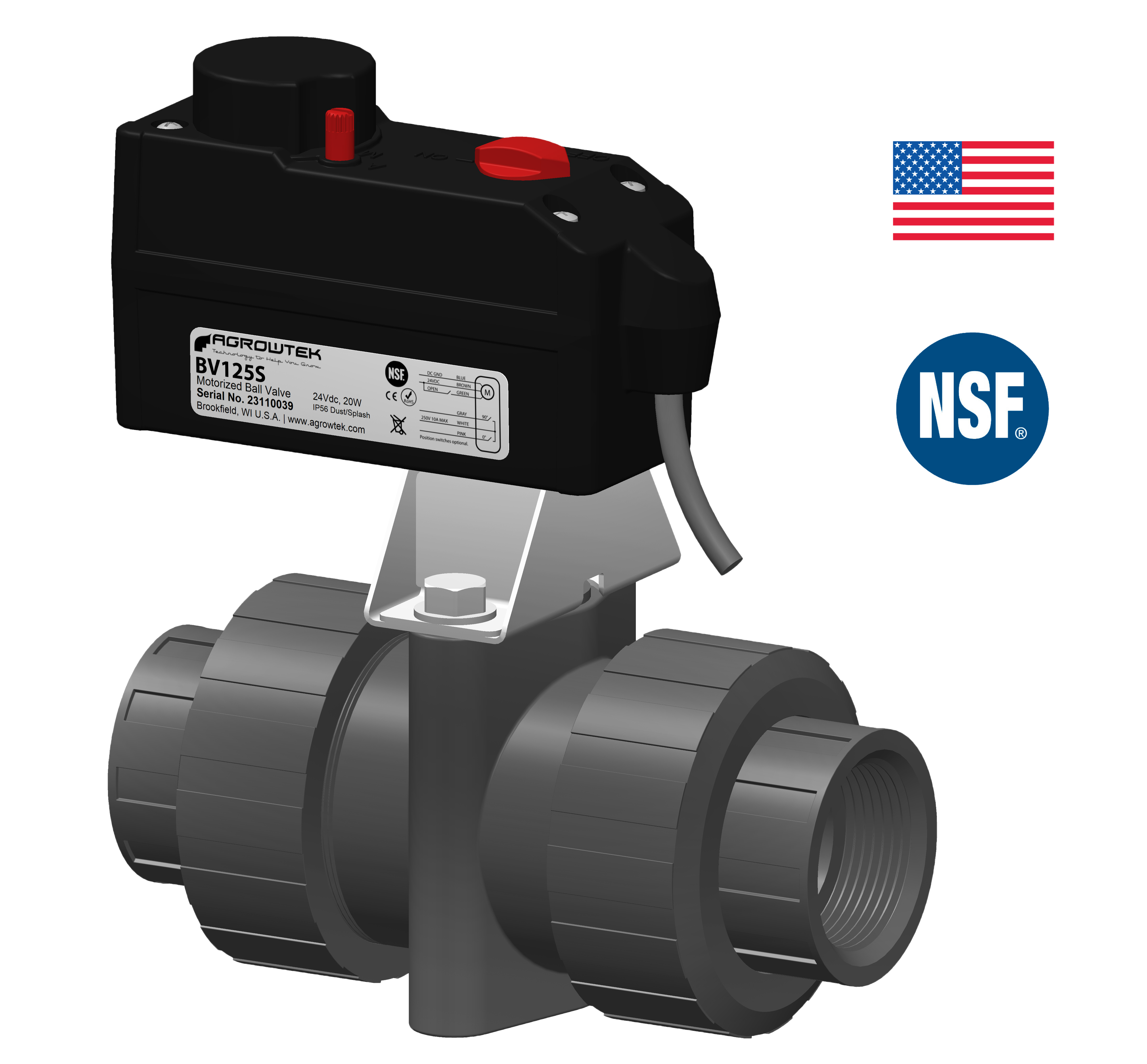 This rugged, motor-actuated PVC ball valve is designed and assembled in the USA for demanding agricultural applications requiring irrigation control and facility water management. Tested to well over 100,000 cycles, BV series valves combine high-quality components for reliability that your crop can depend on.