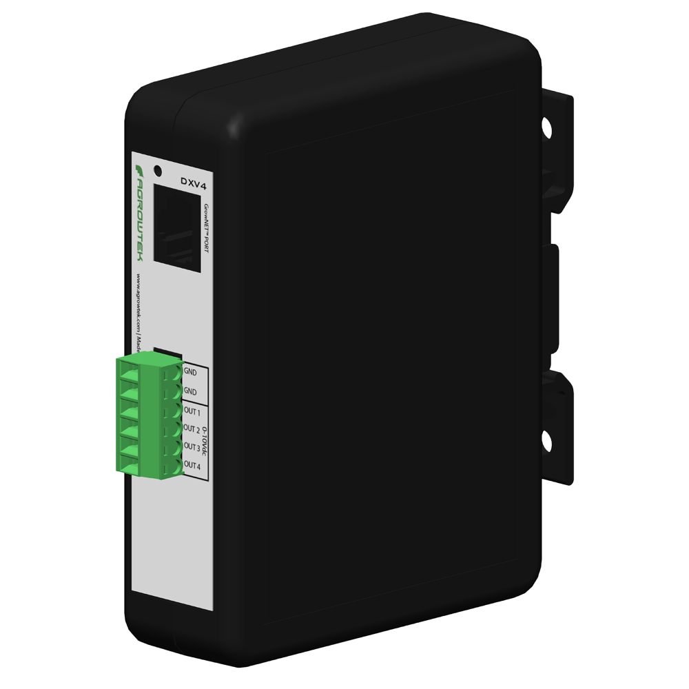 GrowControl™ DXV4 modules for DIN rail feature four (4) 0-10V analog outputs for dimming lighting zones and other analog control. Dim up to 50 light fixtures per output channel.