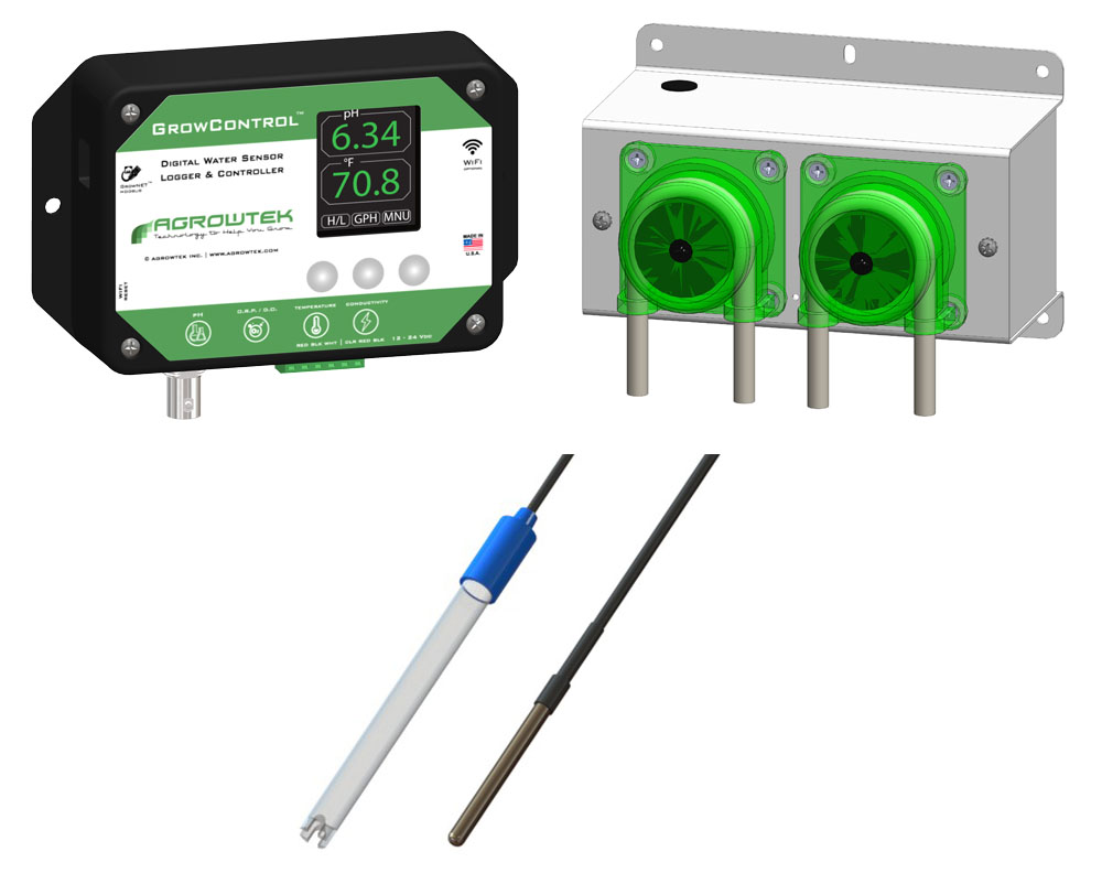 AgrowDose™ MPX dosing systems are autonomous pH set-point control systems consisting of a digital PHX hydroponics controller and ADi intelligent peristaltic pump. Available with 1, 2 or 4 independent pump heads. Configure each pump as a pH up, pH down or ORP part. Precision sensors and rugged pumps offer reliable and accurate control of reservoirs large and small. Built with FDA compliant tubing, the 50ml/min pumps inject chemicals quickly into water lines up to 25psi. The controller's built-in color display provides an easy to use interface for monitoring the sensor readings and configuring the dosing settings. Display includes features such as: