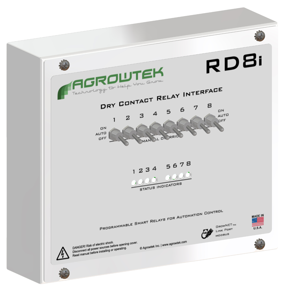 GrowControl™ RD8i relay independently operates eight dry contacts for control of equipment such as: HVAC systems, relay/contactor panels, lighting panels, motor controllers, etc. Connects instantly to Agrowtek's GCX Cultivation Controls or to a SXE sensor via a GrowNET™ port for advanced automated control functions.