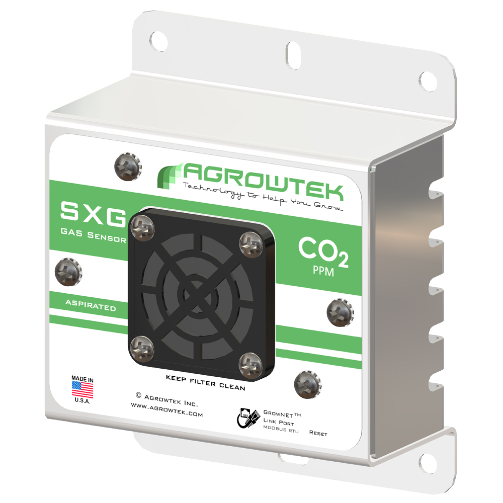 DescriptionGrowControl™ SXG is a precision aspirated gas sensor for CO2 concentration in indoor spaces. Designed for alarm monitoring applications in indoor growing environments. Mounts to grow room wall 12" from the floor or as required by local codes. Use with AXG horn strobe alarms as part of a CO2 alarm system on GCX GrowControl™ controllers. Reliable NDIR sensor technology offers an accurate sensing rage up to 40,000 ppm. Fan aspirated for continuous accuracy and fast response time. Removable air filter can be serviced without tools. Connects to Agrowtek's GrowControl™ Cultivation Controllers as part of a complete facility control solution. One sensor recommended for every 1,500 square feet or as required by local codes. LX2 ModLINK connects GrowNET™ devices to RS-422/485 for MODBUS RTU protocol communication. CO2 Alarm System